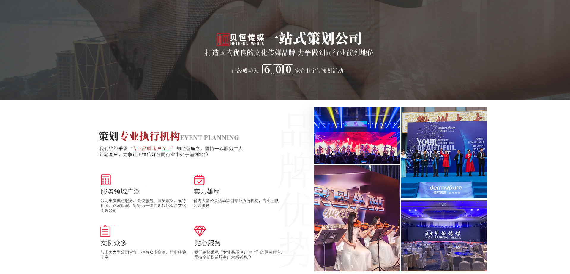 - 合 肥 貝 恒 文 化 傳 媒 專注·專業(yè)·專心·效率 合肥貝恒文化傳媒有限公司2017年成立于安徽·合肥,是省內大型公關活動策劃專業(yè)執(zhí)行機構,公司集慶典服務、會議服務、演員演藝、模特禮儀、路演巡演、展會特裝、廣告制作、設備租賃、舞美策劃、企業(yè)形象宣傳等為一體的現(xiàn)代化綜合文化傳媒公司,我們始終秉承“專業(yè)品質客戶至上”的經(jīng)營理念,堅持全...